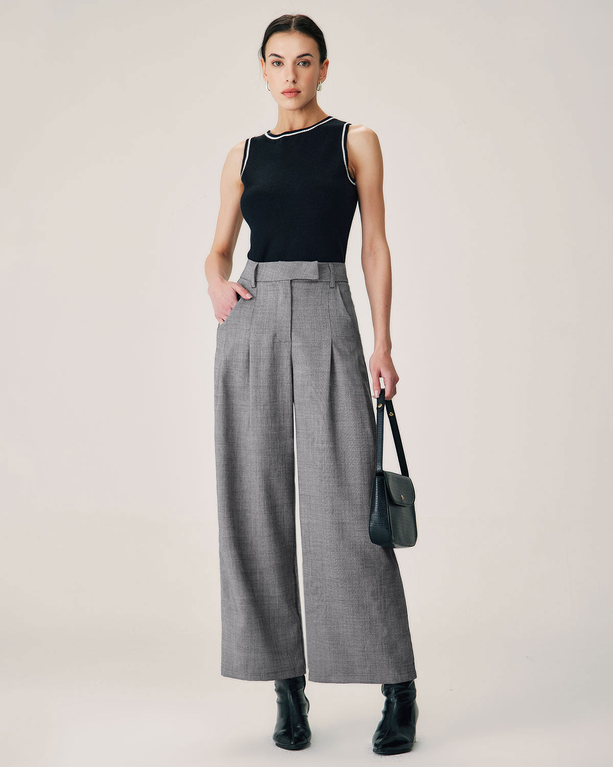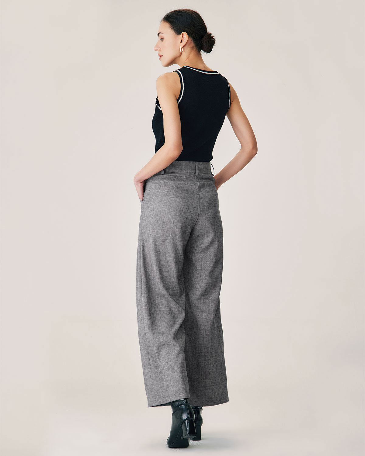 These pants are designed with a natural waistline and offer a comfortable and flattering fit that complements all body types. The straight-leg silhouette exudes timeless elegance, while the soft grey hue makes them effortlessly stylish and easy to pair.